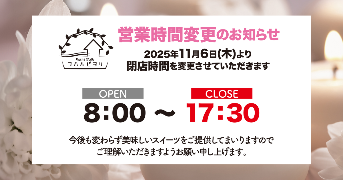 これまで18:00までの営業でしたが、17:30閉店に変更となります。